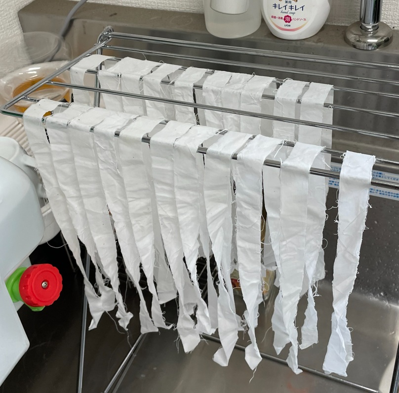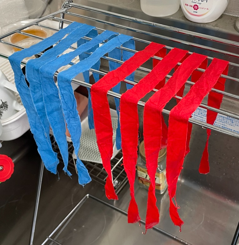 放送大学の実験授業で使うための染色布を準備しました。細長く切った木綿布を漂白し、それを染色しました。塩素系漂白剤や酸素系漂白剤の効果を視覚的に確認するためのものですが、事前に放送大学のゼミで、学生さんにどの染料が適しているのかということをテストしてもらっていました。その結果から選んだ直接染料1種と酸性染料1種です。なかなかきれいに染まりましたね。