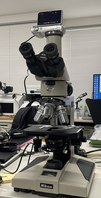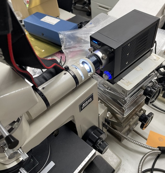 研究室に新たに顕微鏡を導入しました。中古ですが、落射の微分干渉観察が可能とのこと。物体の凸凹を色変化としてとらえることができるとのことで、表面の微細構造を見るのに使えればと思っています。14万円ほどで入手しましたが、さすがに透過型の微分干渉観察用のあれこれは付いていませんでしたが、微分干渉タイプのレンズや、SONYのαシリーズのマウントに接続できるアダプターがついていたのでコスパは十分かな。今後、汚染物の表面観察等で活躍してもらいたいと思っています。